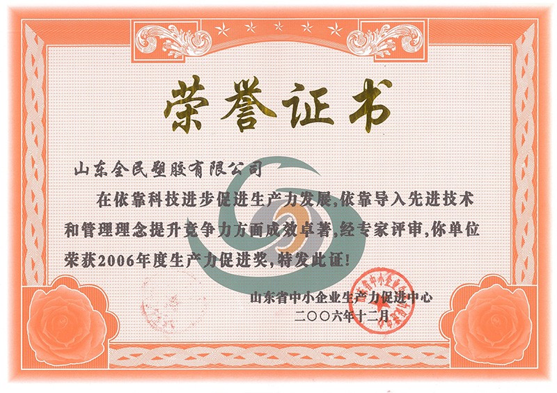 省級生產(chǎn)力促進(jìn)獎榮譽證書-2006.12